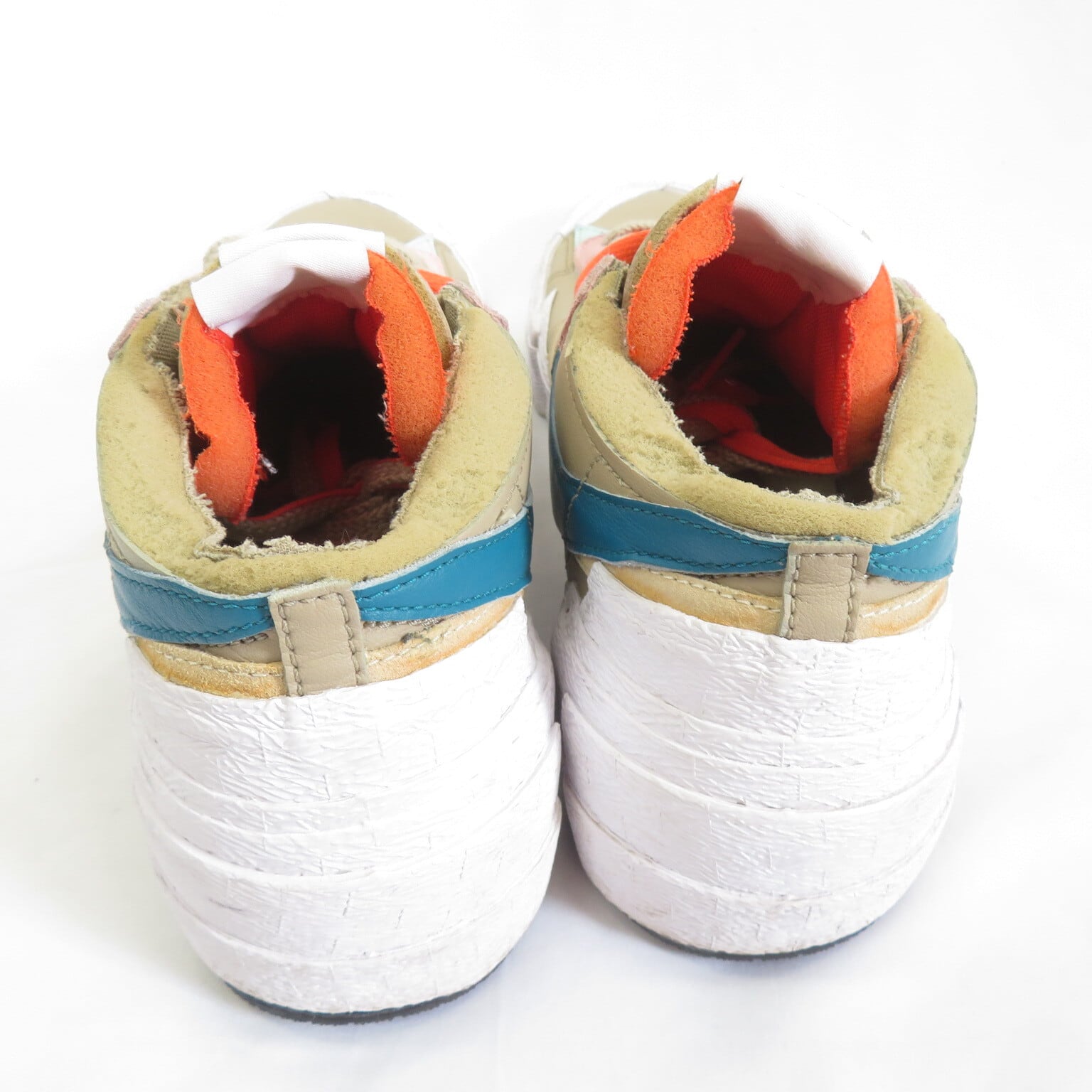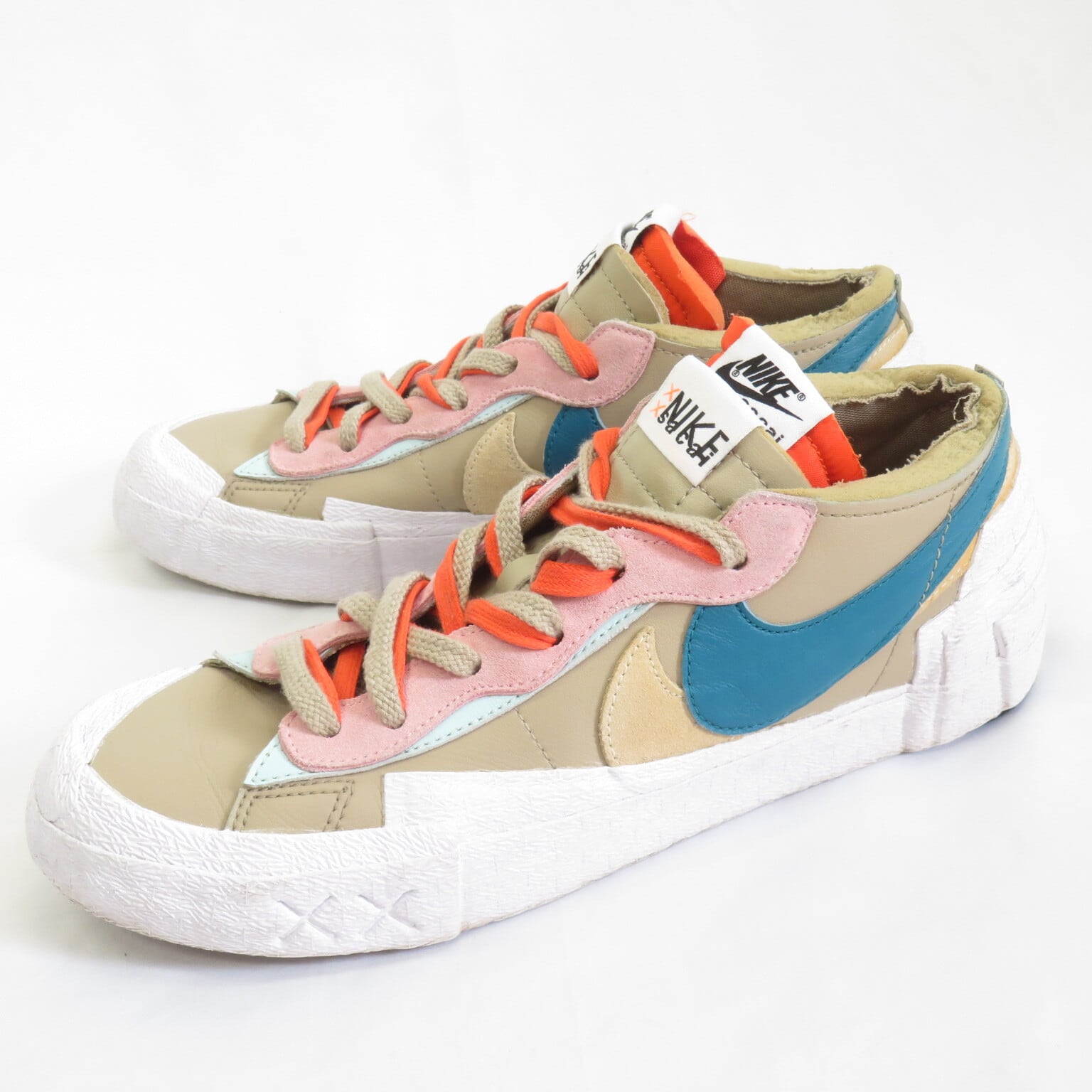 阿部千登勢氏が手掛ける日本発のファッションブランド"SACAI"と、ニューヨーク州ブルックリンを拠点に活動するアーティスト"KAWS"とのトリプルコラボレーションモデル「BLAZER LOW」。ベースには「NIKE DUNK」と「NIKE BLAZER」それぞれのシュータン、シューレース、SWOOSHが2重に重なり合ったデザインを採用。"KAWS"の作品シリーズである"URGE"をイメージしたコントラストの効いた色合いを加え、カスタムカラーを制作。ミッドソールに"KAWS"を象徴する"XX"のモチーフをレーザーで刻印したスペシャルエディションとなっています。